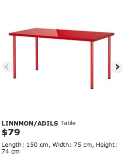 ; LINNMON/ADILS Table (Red) $79.- ; Length: 150cm, Width: 75cm, Height: 74cm ; By Andy (2014) CS RESET SETBG 43 ; choose background 43 TO linnmon RU 90 FD 0.74 RD 90 SETSCALE 1.5 0.04 0.75 SETMAT 13 34 BOX ; table top FD 0.33 RT 90 FD 0.7 REPEAT 2 [ RD 90 FD 0.36 RU 90 SETSCALE 0.04 0.72 0.04 SETMAT 13 34 ; red as table top CAN ; table leg 1 RD 90 FD 0.37 RU 90 SETSCALE 0.04 0.02 0.04 SETMAT 0 30 ; black material CAN ; leg shoe RU 90 FD 0.73 RD 90 RT 90 FD 0.66 RD 90 FD 0.36 RU 90 SETSCALE 0.04 0.72 0.04 SETMAT 13 34 ; red as table top CAN ; table leg 1 RD 90 FD 0.37 RU 90 SETSCALE 0.04 0.02 0.04 SETMAT 0 30 ; black material CAN ; leg shoe RU 90 FD 0.73 RD 90 RT 90 FD 1.4 ] ; now bring the turtle back to where it starts BK 0.7 LT 90 BK 0.33 RU 90 BK 0.74 RD 90 END ; create the table linnmon