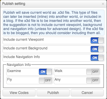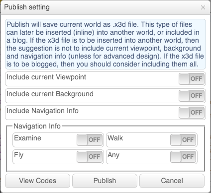 Then, I will need to publish or export this one piece of snow to x3d files so I can use it later in blogs or other virtual world. There are generally two types of x3d files you can publish in VRMath2 Editor. The first one is to be used in blog so inclusions of viewpoint, background information, and navigation infromation are recommended. The image below shows the option I selected when publishing for blogging.