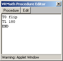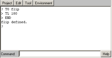 If your procedure is correct, you will see the message "flip defined" in interactive message text area. By now, you have created a procedure named flip. Flip has become a command or primitive with no parameter. You can now invoke flip command by typing in flip in command input text field and you will see the turtle flips.