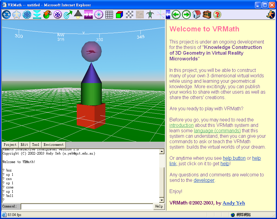 VRMath is an open, online VRLE (Virtual Reality Learning Environment), in which users can use a Logo like language to construct 3D virtual worlds. During the construction processes, users will improve their spatial ability by linking their mathematical language to 3D real time graphics, and participating in online community. Below is a snapshot of VRMath.